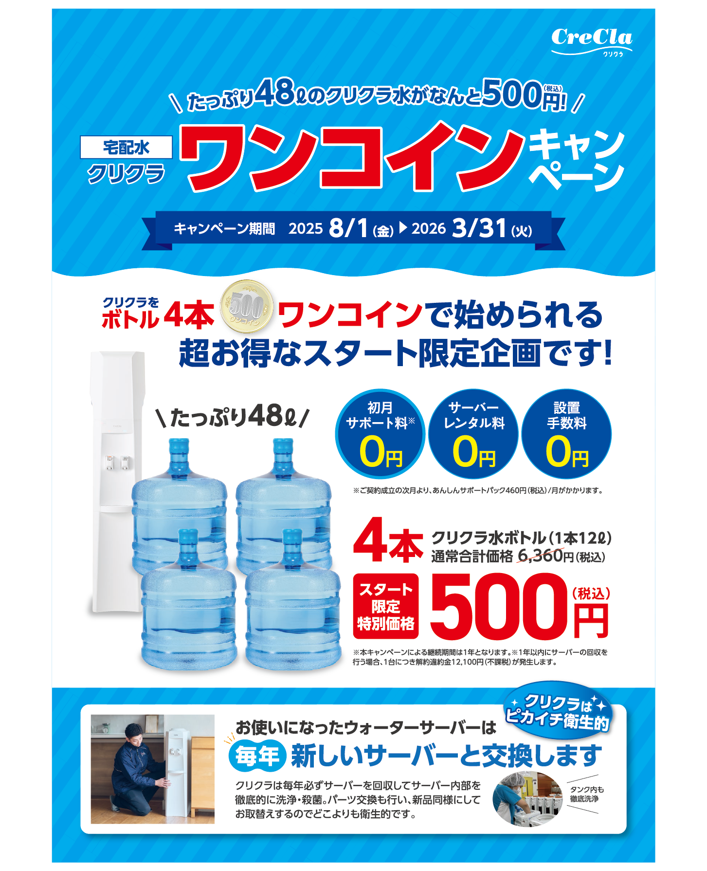 期間限定でもれなくクリクラボトル4本(48ℓ) 500円からスタートできます!