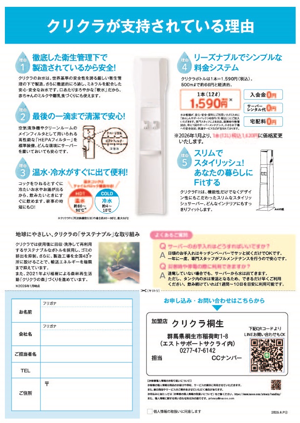 クリクラ桐生(当店運営の宅配水事業です)にて新規ご契約いただくお客様は、