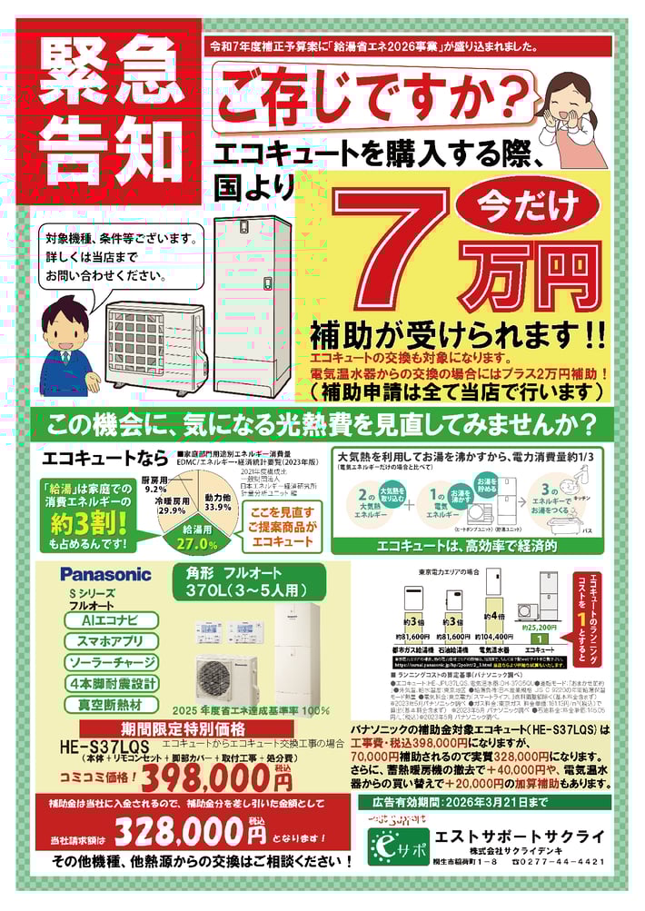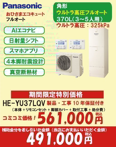 ※エコキュートはお得な特別クレジット(金利1%)がご使用いただけます。ご希望の方はご相談ください。